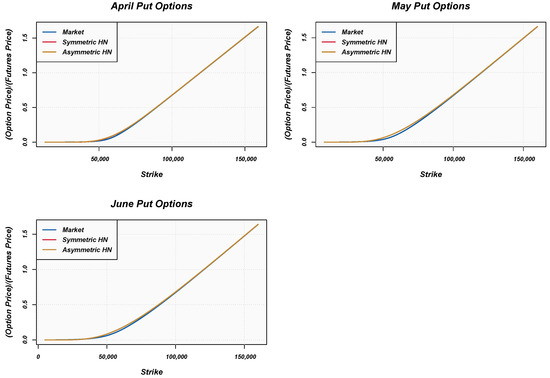 In this study, the parameters and are calibrated to historical Bitcoin futures returns (under the real-world measure) using maximum-likelihood estimation. When estimating the symmetric Heston–Nandi (HN) model, the asymmetry parameter takes a value of zero.