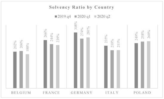 The reduction in solvency ratio is not observed across all countries. Across the whole European Union, in the first quarter, the average solvency ratio across all insurance undertakings reduced by 17% to 225%. By Q2 of 2020, the solvency ratio increased slightly to 226%. There was a considerable difference between different countries. In Belgium, France, Germany, and Italy, we observed a decreasing trend.