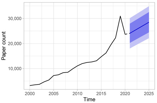 Total number of papers matching the search keywords in the Scopus database in the years 2000–2020, along with a forecast for the next 5 years obtained by a linear model. Shaded areas are the 80% and 95% confidence intervals.
