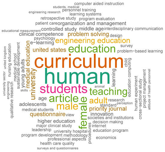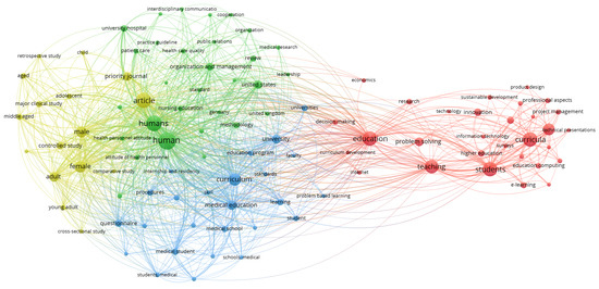 The following Figure 4, obtained with the VOSviewer software1 shows a pictorial representation of the most represented index keywords in the papers selected. The size of vertices is proportional to the number of occurrences of each keyword and edges are drawn between two vertices if the keywords associated to them occurred together more than a pre-determined number of times. Four clusters, drawn in different colors, are visible in the chart. Interestingly, the rightmost cluster groups keywords roughly related to education in general, especially coupled with aspects such as problem solving, innovation, and technology. Additionally central in this cluster is the keyword “students”. In the other three clusters, keywords related to the health sector seem to be prevalent. However, looking more closely, the yellow cluster to the left groups keywords specifically related to medical studies (e.g., “controlled studies” and “retrospective study”, an essential distinction), while the blue cluster mainly references topics in medical education (e.g., “medical education” and “medical student”) and the green cluster focuses on managerial aspects in healthcare and elsewhere (e.g., “organization and management” and “health care quality”). Although the total number of papers in medicine and health sciences in general was not particularly large, the prevalence of medicine-related terms could be due to a denser concentration of the involved keywords in the papers belonging to social and physical sciences, where the average number of citations attracted by a keyword was apparently larger.