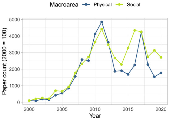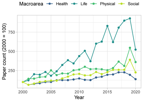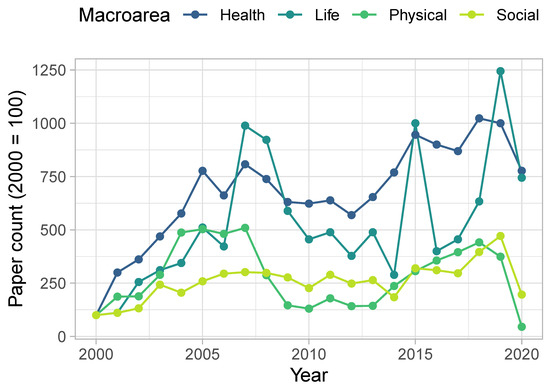 Count of papers matching the search keywords in the Scopus database in the years 2000–2020, per macroarea.