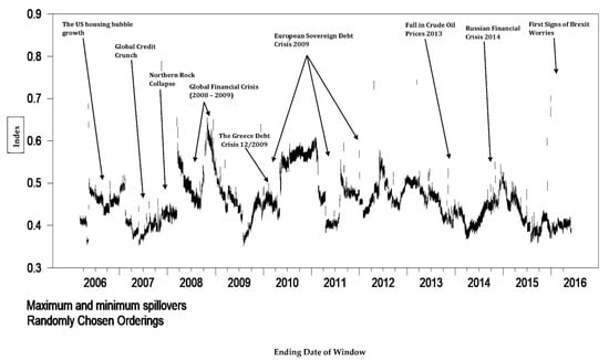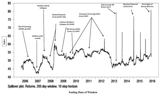 In this paper, the authors provide evidence of transmitted volatility spillover from one market to another. This opening up, particularly after the 2008 financial crisis, amplified the importance of the spillover channels in the stock and the foreign exchange markets. This is due to the repercussions of the shocking types of financial risks stemming from the interconnected nature of the financial markets. Thus, there is a shred of growing evidence in the literature that supports the association of return and volatility spillovers with global economic events and financial crises (for reviews see (), (), (), (), (), (), (), (), ()). In addition, the recent financial crisis demonstrates the severity of the cross-market volatility spillovers, which transmitted across countries through the stock and foreign exchange markets’ channels (for reviews see (), (), (), (), (), ()). Another important feature of the foreign exchange spillover channels is that their effects act differently during, before, and after the economic events and financial crisis episodes. For example, based on VAR models, () examined nineteen global equity markets from the 1990s to 2009. They found striking evidence that return spillovers displayed a slightly increasing trend but no bursts, while volatility spillovers displayed no trend but strong bursts associated with crisis events.