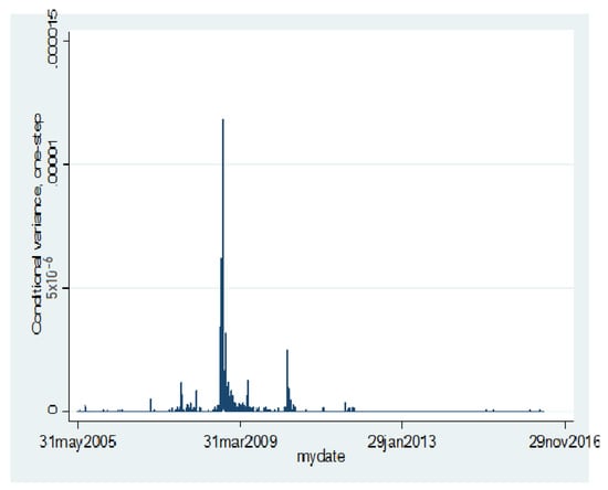 The LM results show the null and alternative hypotheses, the statistic and its distribution, and the p-value, which indicates the presence of ARCH (p) model disturbance in the data. Thus, we estimate the ARCH (1) model and generate the forecast error variance, which is essentially an in-sample prediction model based on the estimated variance function (see Equation (19) for more details). Table 7 shows the result of the conditional variance of the estimated ARCH (1) model. The conditional variance in the ARCH model is allowed to change over time as a function of past error leaving the unconditional variance constant (). Then, we proceed by plotting the forecast error variance against the time period of our sample (2005–2016). Figure 5 shows the result of the ARCH (1) model, which implies that the volatility spillovers from developed countries to the developing countries seem to be specifically strong in 2008.