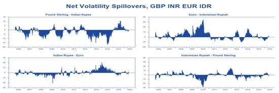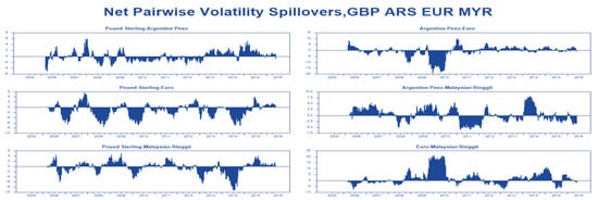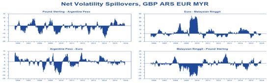 During the time period of our sample (2005–2016), there were two major events of net volatility spillovers through the global foreign exchange market, in particular, during the 2008/2009 financial crisis and the European sovereign debt crisis in 2009/2013. However, before the recent financial crisis and the European sovereign debt crisis, the net volatility spillovers between developed and developing countries was relatively low; however, things changed drastically after 2007, when the net volatility spillover from the EUR to the Malaysian ringgit (Figure 8) jumped to 20% in the third quarter of 2008 and 40% in the third quarter of 2009. These results are consistent with the time-varying volatility results, which imply that the foreign exchange market experienced low volatility from 2005 to 2007. The pound sterling (GBP) and the Euro (EUR) (Figure 6, Figure 7, Figure 8 and Figure 9) both act as giving and receiving of the net volatility transmissions, with almost similar magnitudes across the global foreign exchange markets. This finding supports the static analysis of the spillover index (Table 4) that the pound sterling (GBP) and the Euro (EUR) are the main contributors of volatility spillovers.