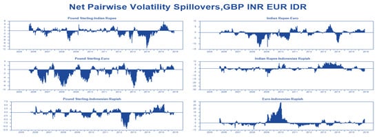 This figure shows the net pairwise volatility spillovers between developed and developing countries. In particular, the net pairwise volatility spillovers from/to the Pound Sterling (GBP), Indian Rupee (INR), Euro (EUR), and the Indonesian Rupiah (IDR).