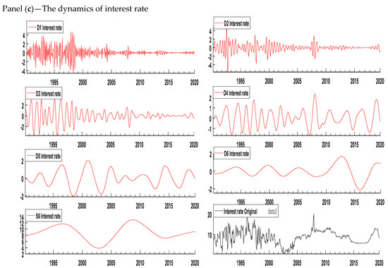 where are the detail components and wavelet crystals, j = 1, 2,3, …j, is a trend component also called the wavelet smooth, and j represents the number of scales (frequency bands). In other words, a variable Xk is exuded by a high-pass filter and a low-pass filter at each step. We obtain the information across different frequencies in each step until we reach an approximated variable that contains only the trend. This approach allows us to investigate the time series in both the time and frequency domains simultaneously. In this paper, we employ the maximum overlap discrete wavelet transform (MODWT) for time–frequency decomposition.