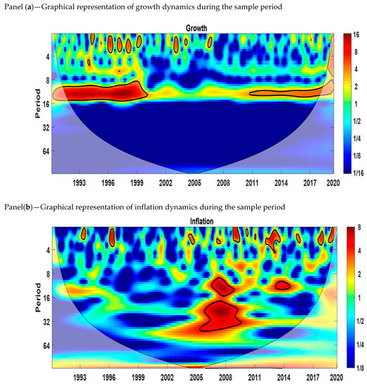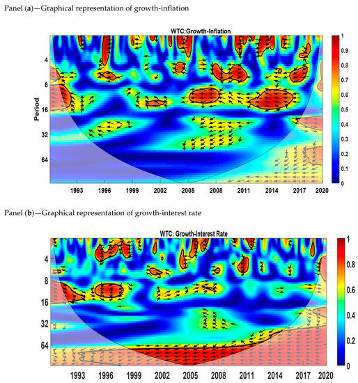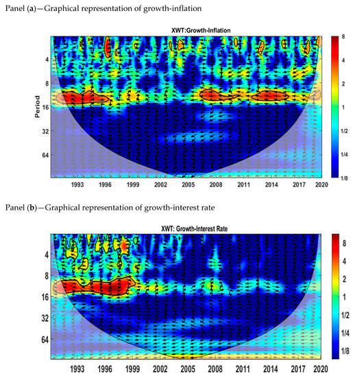 Cross-wavelet coherence shows the areas in the time–frequency range where the two variables co-vary but the presence of high volatility is not necessary. We used this tool to determine both the frequency bands and time intervals in which variables are correlated with each other. The area within thick black color shows the 5% significance level calculated from Monte Carlo simulations. The red color shows the regions of high co-movement between variables, while the blue color represents no co-movement. The phase difference between variables is represented by arrows. The direction of arrows tells us whether variables are in phase or out of phase. When the variables are in phase, it shows that both variables are positively related to each other, and when the variables are out of phase, it means that the two variables are negatively related to each other. Arrows pointing to the right mean that two variables (inflation–growth or interest rate–growth) are in phase, and arrows pointing to the left mean that two variables (inflation–growth or interest rate–growth) are out of phase.