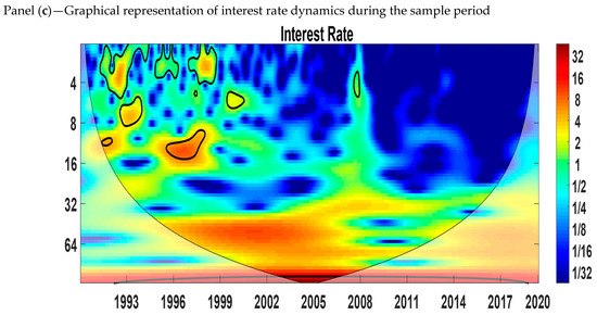 The continuous wavelet power spectrum shows the variables in the time–frequency space. The wavelet power spectra of economic growth, the interest rate, and inflation are shown in Figure 2. The blue color indicates low volatility, and the red color indicates high volatility. The thick black color refers to the 5% level of significance calculated from the Monte Carlo simulation. The X-axis represents the time period studied, and the Y-axis measures the scales or frequencies in months. We can see from Figure 2 that there is an indication of volatility at the 0–4 months scale in all three variables. From panel (a), we observe that growth has high volatility for the medium scale (8–16 months) from 1991 to 2000 and 2010 to 2020. Panel (b) shows that inflation is more volatile at the medium scale (8–16 and 16–32 months) from 2006 to 2009 and 2013 to 2014. At the long-run scale (32–64 months), there is proof of volatility from 2006 to 2009 and 2013 to 2014. Panel (c) shows that the interest rate has high volatility for the medium scale (8–16 months) from 1996 to 1999.