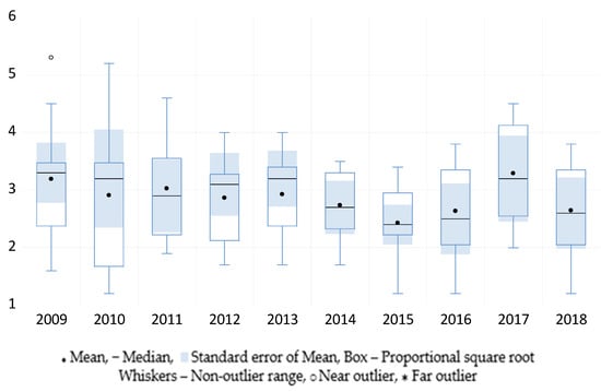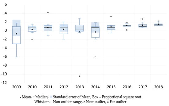 Figure 1, Figure 2 and Figure 3 describe the evolution of banks’ profitability between 2009 and 2018 in CEE countries considered as a group. Over time, mean ROA varied between −0.681% in 2009 and 1.527% in 2018, in some years being lower than median ROA and in others higher, without a special pattern that can be detected. The most striking difference between the mean and median ROA was recorded in 2009 and 2014, when mean ROA at group level was negative (−0.681% and−0.272%, respectively), while mean ROA was in the positive territory (0.668% and 0.8%, respectively). This indicates negatively skewed ROA distributions for these two years and the presence of several low ROA values in some countries that triggered the low mean ROA. These two years were also the ones that show the highest ROA variation among the 11 CEE countries, evidenced by the distance between mean/median and the staples (ends of whiskers in the boxplot). Mean ROA was more volatile over time compared to median ROA, but both have followed a general upward trend between 2009 and 2011, followed by a downward one until 2014 and a subsequent upward evolution until 2018. These fluctuations can be easily explained by the negative impact of the Global financial crisis of 2007–2009 on banking systems all over the world, including the region investigated in our research, followed by another negative impact of the European sovereign debt crisis in 2012. We also note the higher homogeneity of ROA among CEE countries after 2015, suggesting their banking systems’ fast adjustment to the recommendations and rules of the European Banking Authority after the turbulent years of the two crises.