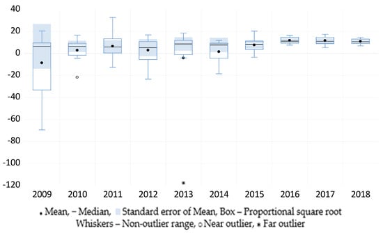 Moving to ROE—see Figure 2—the pattern identified in the case of ROA is generally maintained, except for year 2013, showing a high difference between mean and median ROE in the sample. Mean ROE varied between −8.545% in 2009 and 11.818% in 2016, while median ROE was positive in all years, with the lowest value in 2012 (5.3%) and the highest in 2016 (11.3%). In 5 years out of 10, ROE is negatively skewed, and positively skewed in the remaining 6. At the overall sample level, the lowest ROE was −69.4% in 2009—in Estonia—and the highest 32.7% in 2011—also in Estonia. Similar to ROA, the CEE countries’ differences in terms of ROE have diminished considerably after 2014, indicating smaller disparities in their banking systems profitability, triggered by the countries’ compliance with European Banking Authority recommendations.