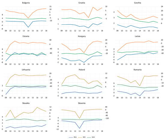 Fourth, at sample level, NIM shows very weak correlation to both ROA and ROE (0.130 to ROA and 0.131 to ROE, none statistically significant) caused by the significant differences at country level—the Pearson correlation coefficient for ROA and NIM varies between −0.577 for Slovakia and 0.808 for Czechia, and for ROE and NIM between −0.449 for Slovakia and 0.840 for Czechia (see Table 3). We also note the virtual no-correlations in Romania (0.007 for NIM-ROA and 0.074 for NIM-ROE), Poland (0.096 for NIM-ROA) and Estonia (−0.04 for NIM-ROA). This suggests that banking systems with high NIM, as is the case with CEE countries, were not necessarily good generators of high ROA and ROE. Moreover, capturing banks’ performance by considering only NIM overlooks other aspects related to the credit process, as well as the requirements embodied in the RAROC (risk-adjusted return on capital) modeling system (). Nevertheless, one cannot overlook the robust profitability of banks in the CEE region, driven by surging lending and improvements in assets’ quality, the latter being correlated with the requirements imposed by Basel II and Basel III.