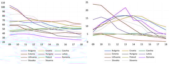 Regarding the macroeconomic variables, we note the improvement in public deficits in all CEE countries after 2009 and, in many countries, the transformation in the public surplus towards the end of the period (Bulgaria, Croatia, Estonia, Latvia, Slovakia and Slovenia), although this was not higher than 2% of the GDP. The exceptions were Czechia (the surplus in 2010, 2011 and 2014 transformed into a slight deficit in 2017 and 2018) and Romania (deficit after 2016, fueled by the populist measure of the social-democratic government). In the inflation area, all CEE countries saw their prices diminish their increase after 2011, while several of them even experienced deflation between 2014 and 2016 (Bulgaria, Romania, Croatia, Slovenia, Poland, Lithuania and Slovakia). The unemployment rate, the last macroeconomic variable used in our research, was on a robust downward trend in all CEE countries after 2009, although it somewhat increased between 2011 and 2013. Thus, the 11 countries included in our analysis had unemployment rates ranging between 5.86% (Slovenia) and 17.51% (Latvia) in 2009, but only ranging between 2.24% (Czechia) and 8.43% (Croatia) in 2013. The labor conditions in the CEE region have improved and real wages rose in almost all countries, which helped the decreasing unemployment trend ().
