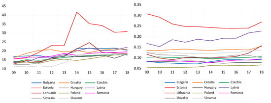 All banking systems in CEE countries have recorded important increases in their solvency rates, particularly until 2013–2014, illustrating the strengthening of banking activities after the global financial crisis of 2007–2009 (see Figure 6, left panel). After 2014, however, solvency rates slightly declined in several countries (Bulgaria, Lithuania, Slovakia and Slovenia), but most importantly in Estonia, due to the 2% increase in systemic risk buffer requirement set by Estonian Central Bank () for commercial banks in August 2014. The situation of Estonian banks is linked to the particularities of the Estonian economy, with a higher-than-average level of investments but modest savings of households and companies, but also of the Estonian banking system, highly concentrated and exposed to risks associated to the same group of countries and sectors. In terms of solvency rates values, they ranged between 12.9% (Lithuania) and 15.75% (Romania) in 2009 and 17.76% (Slovakia) and 31.0% (Estonia) in 2018, after reaching 41.8% in 2014 (Estonia). In this context, it is worth noting that the values of these rates are well above the requirements of the European Central Bank, even for the countries that have not yet adopted the euro (6 out of 11 in our sample).