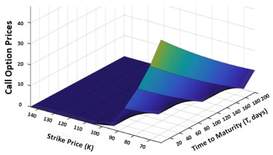 Call option prices against time to maturity (T, in days) and strike price (K, based on ).