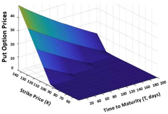 Put option prices against time to maturity (T, in days) and strike price (K, based on ).