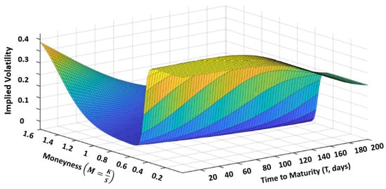 Third, we determine the implied volatilities of our portfolio using the Black–Scholes and Merton model. This provides the expected volatility of our portfolio over the life of the option . Figure 3 is the implied volatility surface with respect to moneyness (M) and time to maturity (T). In particular, we calculate moneyness as the strike price over the stock price, i.e., . Then, the volatilities for call and put option prices are shown in the regions of the surface with and , respectively. The volatility surface demonstrates a volatility smile, which is usually seen in the stock market.