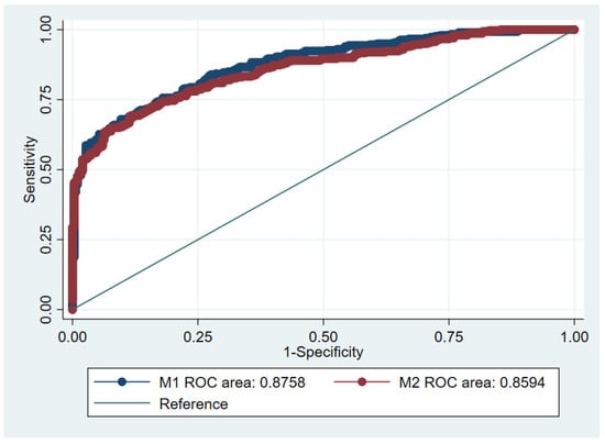Figure 1. The ROC is generated using each possible outcome of the diagnostic test as a classification cut point and corresponding sensitivity and (1-specificity). The area under the ROC curve for M1 was 0.8758, whereas, for M2, the area was 0.8594. The AUC indicates the overall classification accuracy of the model. An AUC over 80% is very good. Both models indicate a very good ability to predict financial distress. However, M1 with both financial and non-financial measures as predictors had a higher AUC, thus indicating the greater predictive ability of the model.