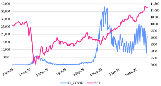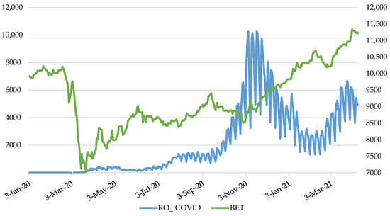 The evolution of the daily BET index quotes vs. no. of Romania new cases of SARS-COV-2. Source: Authors’ own work. Notes: Variables’ descriptions are provided in Table 2.