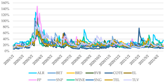 Conditional volatility of stock market shares and BET stock market index over January 2020–April 2021. Source: Authors’ own work. Notes: Variables’ descriptions are provided in Table 2.
