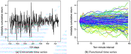 Figure 1 displays the intraday cumulative returns of Apple Inc. In Figure 1a, we plot the intraday cumulative returns as a univariate time series, and in Figure 1b, we segment the univariate time series into daily curves. The collection of daily curves then form functional time series. We utilize the rainbow plot of () to show the time ordering of functional time series, where the curves from older times are in red, and the more recent curves are in purple.
