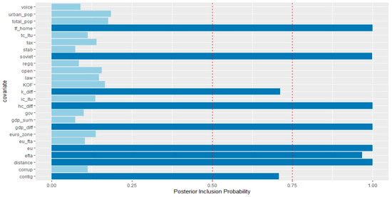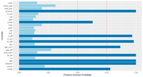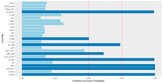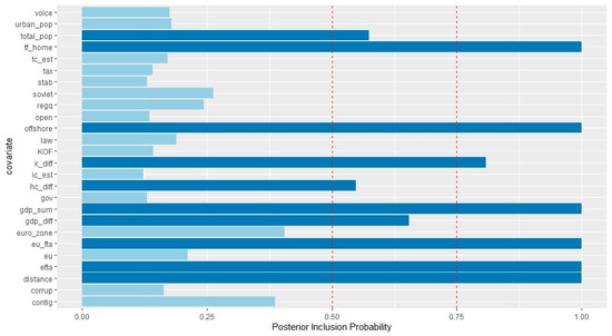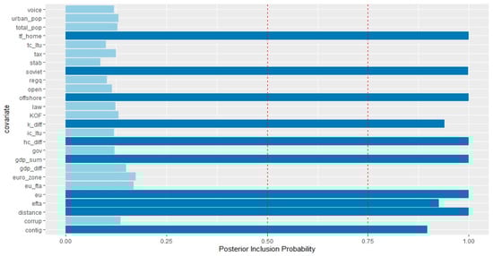 In this section, we report and discuss our estimation results from the BMA analysis of the potential determinants of inward FDI. We report results for the Baltic countries and primarily investigate the vertical motive, the role of the EU, EFTA, and offshore centers in driving inward FDI stocks. Hence, our interest lies in the two groups factors: (a) factors that point to the vertical nature of inward FDI, and (b) factors that may impact the degree of market access, such as entry into the common currency union, external EU FTA agreements, etc. Firstly, we estimate the specification (1) discussed in Section 4 with all of the investment partners present (general case). The results are structured as follows: the reported posterior inclusion probabilities (PIP) reflect the marginal importance of different covariates of inward FDI. As with the existing body of the empirical work on BMA application (Raftery 1995), we consider robust FDI determinants those variables having a PIP above the recommended threshold of 50%. Obtained PIP value for a regressor from 50 to 75% is considered weak, from 75 to 95% positive, from 95 to 99% strong, and >99% very strong. When combined together, variables with an inclusion probability greater than 50% (0.5 in the Figures) define a median probability model (MPM) and under general conditions, the MPM can be considered as an optimal model for analytical purposes and prediction (Barbieri and Berger 2004). Because we relied on the log-linearized model specification for the BMA analysis, our results may suffer from selection bias (Eicher et al. 2012). Further, one of the significant drawbacks of the method is the non-endogeneity assumption on the covariates; hence, due to possible endogeneity issues, our results should be treated with caution. The obtained PIP values for Estonia, Latvia, and Lithuania are presented in Figure 1, Figure 2, Figure 3, Figure 4, Figure 5 and Figure 6. The detailed numerical outputs of PIPs can be found in Table A5, Table A6 and Table A7 (Appendix A). We also report joint measures for our general cases in order to emphasize the relationship between factor endowments and round-trip FDI; outputs of jointness matrices are available in Table A8, Table A9 and Table A10 (Appendix A). The methodology of jointness calculation is based on Ley and Steel (2007).