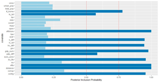 Figure 5 reports the results for a general case in Lithuania. The results demonstrate very strong PIPs for the variables of MNE parent country trade barriers, Soviet dummy, offshore control dummy, human capital difference, joint market size, the EU accession dummy, and geographical proximity of parent country of MNE. Good PIPs were found for physical capital difference and the EU FTA proxy. The general case results find no support for the variables concerning the degree of free speech, host’s total and urban population, host’s trade barriers, national taxation regime, host’s degree of political stability, national regulatory quality, economic openness, quality of domestic legislation, KOF globalization index, host’s investment barriers, national government effectiveness, difference in market size, the Eurozone dummy, and perceptions of domestic corruption. These results imply that, in a general case, both vertical and horizontal motives for FDI are present in Lithuania, with market access (the EU accession, Soviet dummy, and the EU FTA dummy), and joint economic size driving the horizontal motive, while physical and human capital differences are driving the vertical motive of FDI. Similar to other Baltic countries, Lithuania also experiences inward FDI from the MNE parent countries that are located in close geographic proximity, e.g., the EU, the EFTA, and the Baltic Sea region.