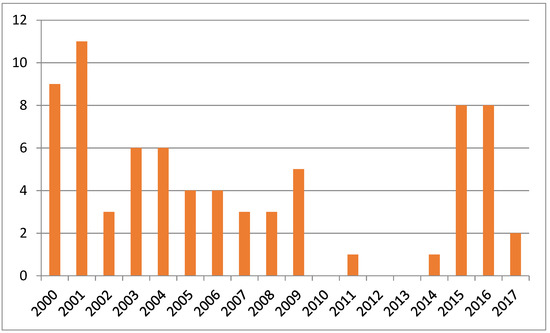 The full set of the event days selected is presented in Appendix A, while Figure 1 below depicts the number of event days per year over the period 2000–2017; our event days stop at the end of 2017, as this is the last year that the GTD reports information related to terror attacks. As can be seen, the first decade of the 21st century was characterized by a significant number of attacks every year, while the early part of the second decade was rather ‘quiet’ until 2015, when it peaked again with major attacks in countries such as France, Spain, Belgium, and Germany. It is worth noting that the perpetrators during the first decade were organizations such as Al-Qaida, as well as ones with a more local focus, such as the Basque Fatherland and Freedom (ETA), National Socialist Underground and Corsican National Liberation Front (FLNC), while in the second decade, the attacks were mostly carried out by the Islamic State of Iraq and the Levant (ISIL) and other Jihadi-inspired extremists. Regarding the type of attack, 46 out of the 74 attacks (which corresponded to the 63 event days) were bombings/explosions, while the total number of deaths from all 74 events was 532, with another 3593 wounded. We also noted that 26 events were related to attacks on ‘business targets’, 14 on ‘private targets’, and 13 on ‘government-related targets’, while the remaining 21 events were spread across transportation, religious, and military targets.