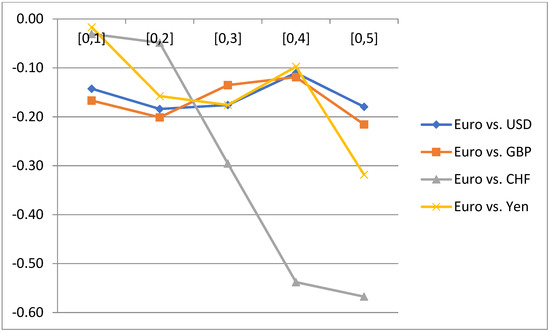Results regarding all CAR are summarized in Figure 3 and reveal some interesting patterns. It seems that, in the cases of the Dollar and the Pound, more negative CAR are more evident in the earlier event windows ([0, 1], [0, 2]), while in the cases of the Franc and the Yen we observe higher negative CAR in the latter event windows, particularly in the final one [0, 5]. All in all, it seems that the Euro depreciates more vs. the Dollar and the Pound in the earlier event windows, while in the latter event windows, the depreciation vs. the Yen and the Franc is more evident. Nonetheless, it should be noted that the statistical significance of the Dollar and Pound results is relatively stronger.