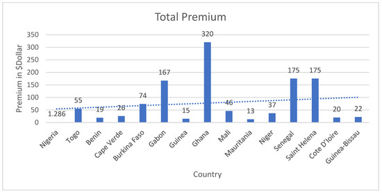 Total insurance premium of West African Countries. Source of data: Re Swiss 2018 (https://www.swissre.com/institute/, accessed on 15 February 2021).
