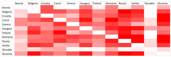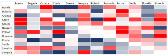 Considering the information in Figure 1, it is possible to see that some markets were more affected than others. For example, Slovakian and Bosnian markets seemed to be less affected than others (the respective columns have, in general, lighter color). On the opposite side, Russian, Romanian, Serbian, and Slovenian seem to have been the most affected markets. Figure 2 presents the information about the net transfer entropy between the indices, indicating the net influence; making it possible to identify that Greece, the Czech Republic, and Poland were the biggest net influencers while Serbia, Slovenia, and Russia were the most net influenced indices.
