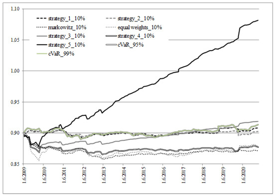 The fourth strategy (strategy_4) is the opposite of the previous one. Here, the investor is focused on negative returns, i.e., losses, with the lowest values of pair-wise NTEVs between countries. The investor is focused on suffering the least loss when bad times occur in the markets. So, if the markets fall, i.e., the losses occur on stock markets, the investor includes only those country indices that have the least amount of pair-wise spillovers. Again, the lowest five pair-wise NTEVs are observed. The final, fifth strategy (strategy_5) is the combination of the third and fourth ones. The investor includes those country indices in the portfolio that have positive returns and the greatest NTEVs between countries, with the inclusion of those indices that have the lowest spillovers when the returns are negative.