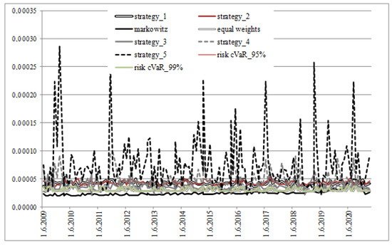 Next, investors are interested in risk series as well, as this is another parameter that determines the utility obtained from a strategy. We plot the risk values of every strategy from Figure 3 to Figure 4. As the minimum variance portfolio has the lowest risk over time, it is, of course, the best performing in this case. Again, strategy 5 catches the eye, due to it having the greatest volatility over time and having the greatest spikes of risk overall. As this strategy is the most demanding one in terms of its description, the investor has to do a lot of rebalancing over time. This affects the volatility. Furthermore, as in this case the investor aims for the greatest positive return NTEVs, greater returns come with greater risks. Again, all other strategies are in between.