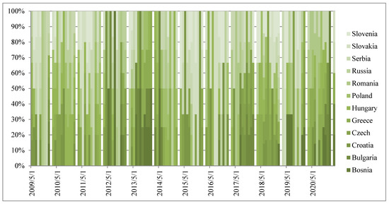 Regarding the data, we retrieved the data from Investing (2021) for 12 different stock markets: Bosnia, Bulgaria, Croatia, the Czech Republic, Greece, Hungary, Poland, Romania, Russia, Serbia, Slovakia, and Slovenia, from 1 June 2008 until 5 March 2021, in total 3188 observations. After the application of the log returns, we had a total of 3187 observations. The data refers to stock market indices, in index point values (for descriptive statistics, please see Appendix A, Table A1).