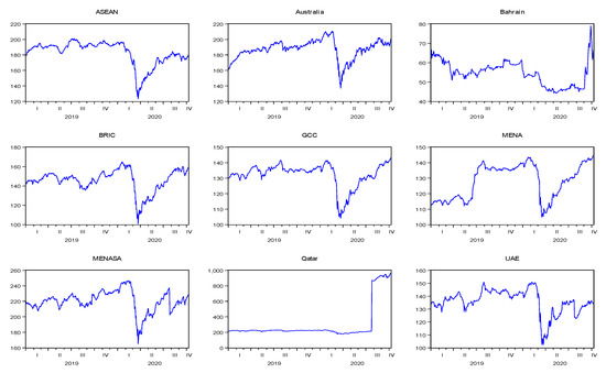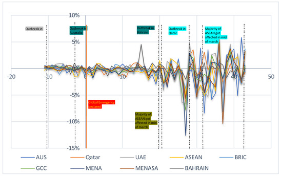Table 3 represent the abnormal returns of all the indices on the event day, 1 day, and 2 days after the event day, represented as , , , respectively. On 30 January 2020, as news broke out from China, the Islamic stock indices of Australia, UAE, ASEAN region, BRIC, GCC, MENA, MENASA, Bahrain reflected a negative return on the first day. Qatar was the only country which remained stable as an Islamic stock market. However, on the following day, the market reacted in a mixed manner with growth in the Islamic index of Australia at 0.4%, UAE at 0.12%, and MENA at 0.1%. In contrast, there was –1.2% return on the ASEAN Islamic stock market, i.e., a negative return. On the second day after the WHO announced the COVID-19 global emergency, the Islamic stock markets dropped by 1.3%, 1.0%, 0.8%, 0.77%, 1.8%, 0.4%, and 0.1% in Australia, Qatar, UAE, ASEAN region, GCC, MENA, MENASA, and Bahrain, respectively.