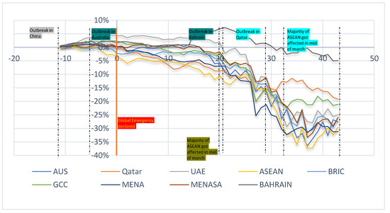 Figure 1 represents the graphical plot of abnormal returns (AR) of selected indices. The graph shows the daily abnormal return from 11 days to 43 days until the event. Furthermore, the returns proved to be more volatile and diffuse after the first short event window. The reason for more dispersed AR is the spread of virus in almost all regions of the world including GCC, MENA, ASEAN, and other countries as well. Australia was one of the countries where the first case appeared on 25 January 2020. According to the WHO situation report–71, by the start of March, COVID-19 cases started to grow exponentially in more than 200 countries. Consequently, its effect started to emerge in terms of negative and fluctuating abnormal returns in all Islamic stock markets around the globe. A more accurate picture of COVID-19 crisis is shown in Figure 2. CAR from −11 days to 43 days represents how quickly markets declined around the globe. From day 0 to 31 March, the Islamic stock indexes of Australia, MENA, BRIC, MENASA, UAE, and ASEAN dropped by 27.32%, 31.53%, 23.7%, 26.16%, 29.18%, and 26.16%, respectively. However, the market return for the Bahrain index proved to be most stable among the rest of the Islamic indices. The reason behind this stability appears to be a smaller number of cases till 31 March 2020. In Bahrain, there were only 569 total cases of COVID-19 by the end of March. Furthermore, the Bahrain stock index was the least affected by the COVID-19 pandemic.