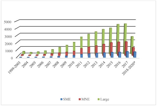 The level of non-financial reporting depending on the size of the enterprise. * As the information for 2018–2020 is incomplete due to ongoing data collection and the Standards Report Registration process, the search on the report year filter is disabled for the years 2018 and 2019. This change was made to avoid any data or trend misinterpretations. 2018–2020 years—these reports were found using the other available filters, therefore, a total value is shown for this period. Source: owned elaboration based on (GRI n.d.) (24.11.20.).