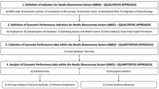 The practical part of the research and its methodology conducted in this study is observational and cross-sectional. The observational research methodology was designed in four different stages with the integration of so-called hybrid research techniques, which consisted of qualitative and quantitative research approaches. The first two stages in this study were conducted with qualitative research approaches in order to define the criteria and indicators for Nordic Bioeconomy Sectors (NBES) and their economic performance as defined in the conceptual framework. The particular reason for the selection of a qualitative research methodology in defining NBES and economic performance was applied due to the potential of grounded theory for the practical research. The grounded theory encouraged the development of a new conceptual framework of the Nordic Bioeconomy Sectors (NBES) that emerged from the analysis and observation of previous research studies (Rodino et al. 2020; Ronzon and M’Barek 2018; Ronzon et al. 2020; Wydra 2020).