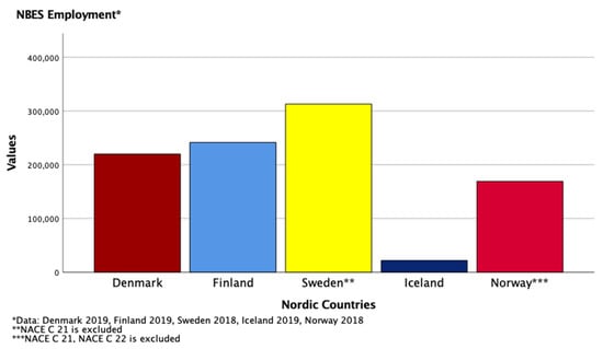 To begin with, the descriptive findings highlight the employment and economic performance of the bioeconomy in 2018–2019 in the Nordic region by country and respective Nordic Bioeconomy Sector (NBES), as defined in the conceptual framework of this study. For this reason, the descriptive results provide a sufficient but non-rigorous answer to the research question on how the economic performance among Nordic Bioeconomy Sectors (NBES) differentiate.