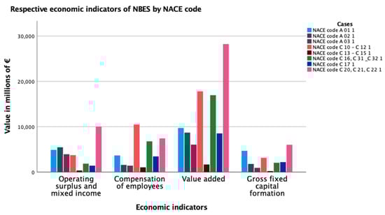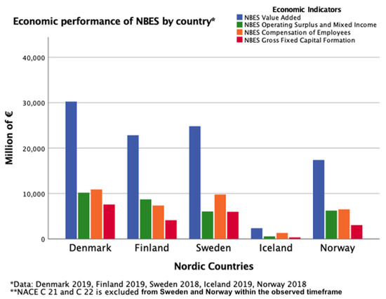 The results of the economic performance of NBES by NACE code within the timeframe of 2018–2019 are illustrated in Figure 5. The major sectoral contributors of value added within the concept of bioeconomy in the Nordic region consisted of three key sectors. The most outstanding sector within the NBES that generated the highest value added was the manufacture of chemicals, chemical products, basic pharmaceutical products, rubber, and plastics (NACE C 20, C 21, C 22), which generated more than EUR 28 billion among the Nordic countries. Secondly, the manufacture of food products, beverages, and tobacco products (NACE C 10–C 12) generated almost EUR 18 billion of value added in the Nordic region, which was slightly more than the manufacture of wood and products of wood as well as the manufacture of furniture (NACE C 16, C 31_C 32), whereas, the sector generated roughly EUR 17 billion in the Nordic countries (Eurostat 2021b).