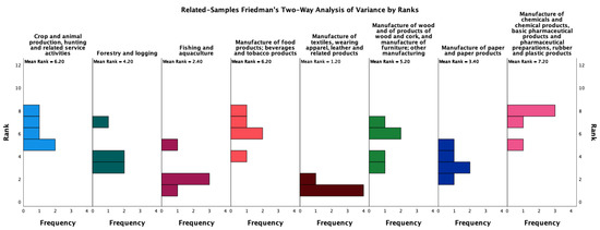 The results of the related-samples Friedman’s two-way analysis of variance by ranks of the Nordic Bioeconomy Sectors (NBES) are portrayed in Figure 6.