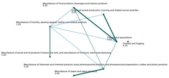 Not only the quality of the relationship from the standard test statistics matter, but the quantity of relationships among Nordic Bioeconomy Sectors (NBES) from the pairwise comparison is hereby crucially worth noting. In this context, there are few sectors that had numerous noticeable relationships from the test of pairwise comparisons in relation with the rest of the Nordic Bioeconomy Sectors (NBES). To begin with, the most noticeable sector was the manufacture of textiles, wearing apparel, leather, and related products (NACE C 13–C 15), which related to five other sectors from the Nordic Bioeconomy concept. Following that, the fishing and aquaculture sector (NACE C 03) had a relationship with four other NBES sectors, as well as the manufacture of chemicals, basic pharmaceutical products, pharmaceutical preparations, and the manufacture of rubber and plastic products (NACE C 20, C 21, C 22).