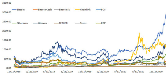 We collected daily prices, dollar volume, and market capitalization for 2500 cryptocurrencies from coingecko.com (accessed on 31 January 2021). Then, we sorted all the cryptocurrencies based on their market capitalization. Finally, we chose the top ten cryptocurrencies from the sorted list. The top ten selected cryptocurrencies were Bitcoin, Bitcoin Cash, Bitcoin SV, Chainlink, EOS, Ethereum, Litecoin, TETHER, Tezos, and XRP. The combined market capitalization of our selected cryptocurrencies covers around 80 percent of the coingecko-based market. Our sample period ran from 11 November 2018 to 31 December 2020 with a total of 781 trading days. Since the starting dates of our selected cryptocurrencies were not same, we chose a starting date of 11 November 2018, which was the first trading date of the latest cryptocurrency of our observed cryptocurrencies. Typically, we have 252 business days per year, however a cryptocurrency investor can invest and exercise every single day of the year; that is 365 days a year.