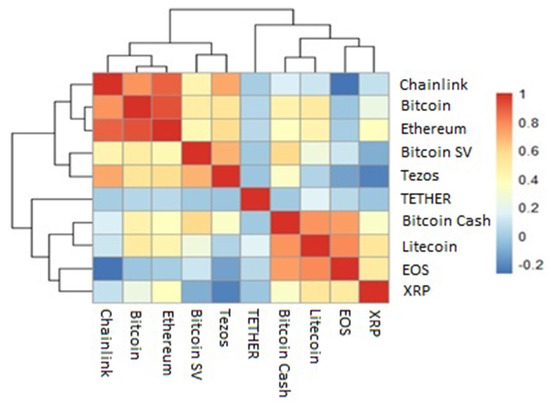 This figure shows the correlation among ten cryptocurrencies. Log prices of all cryptocurrencies have been used to calculate the correlation. Data are daily prices from coingeco.com. The sample period covers 11 November 2018 to 31 December 2020.
