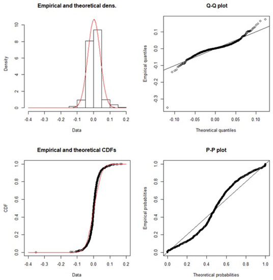 To identify the appropriate model for this study, we initially look at the AIC Akaike (1974) to choose which is the best fit for our prediction. This strategy has been followed for all ten cryptocurrencies. The Box–Jenkins Box et al. (2015) method has been applied for cryptocurrency returns to fit the ARIMA model, and we test normality by plots and find non-normal behavior and use NIG distribution instead (see Figure 3). To consider the leverage effect, we use GJR-GARCH under NIG distribution instead of general models.