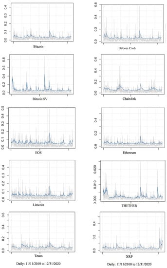 In Figure 6, we forecast the volatility for the ten cryptocurrencies. It shows daily data where the blue line indicates predicted volatility. If we examine the historical return series, it does not show conditional mean offset and thus exhibits volatility clustering.