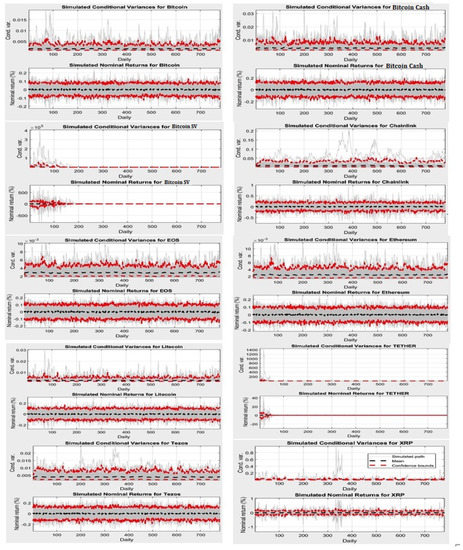 4.2. Monte Carlo Simulations of the Cryptocurrencies’ Volatility Using GJR-GARCH Model