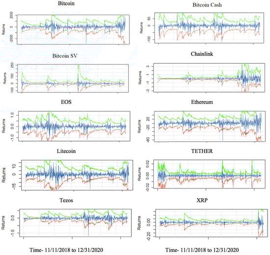 In Figure 8, the jagged red line running across the bottom of the plot indicates the portfolio’s (negative) one-day value-at-risk. For any instance of a cryptocurrency falling below that line, there will occur an exceedance risk. This would predict a value-at-risk measure to experience approximately very few exceedances in under our horizon. We observe that Bitcoin, Bitcoin Cash, EOS, Ethereum, and Litecoin are highly risky assets, because these have many exceedance of jagged lines. Referring to Figure 8, Bitcoin has at least four exceedances of jagged lines. Thus, it supports the hypothesis that Bitcoin is one of the highly volatile cryptocurrencies.