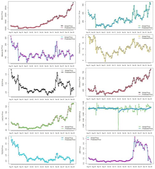 Figure 9 presents a window plot of the predicted price of each cryptocurrency with their actual prices. From close observation we see that ARIMA models also give higher accuracy for the next-cryptocurrency price prediction.