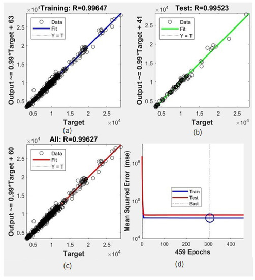 ANN model diagnostics. Validation Performance plot are displayed by the regression plots. (a) Training data set, (b) Testing data set, (c) Overall data set, and (d) Epoachs vs. MSE.
