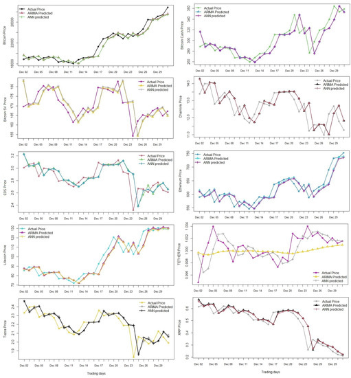 4.3. ARIMA and ANN for Forecasting Cryptocurrencies’ Prices